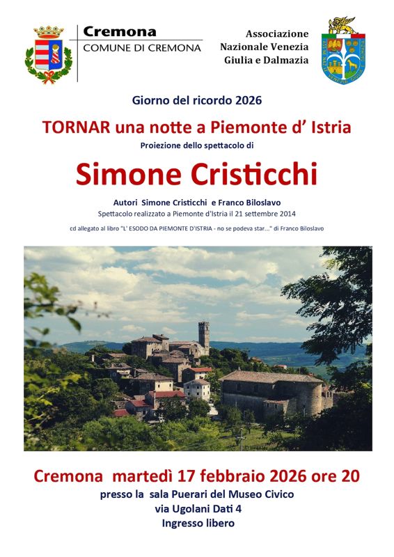 Per la ricorrenza del Giorno del Ricordo tra le iniziative promosse dall'Associazione Nazionale Venezia Giulia e Dalmazia da segnalare martedì 17 febbraio, alle ore 20, nella Sala Puerari di Palazzo Affaitati (via Ugolani Dati, 4), la proiezione del film concerto tenuto da Simone Cristicchi Tornar una notte a Piemonte d'Istria - tratto dal libro L'esodo da Piemonte d'Istria - non se podeva star di Franco Biloslavo registrato a Piemonte d'Istria il 21 settembre 2014 – con introduzione di Tiziano Bellini. L'ingresso è libero e gratuito.