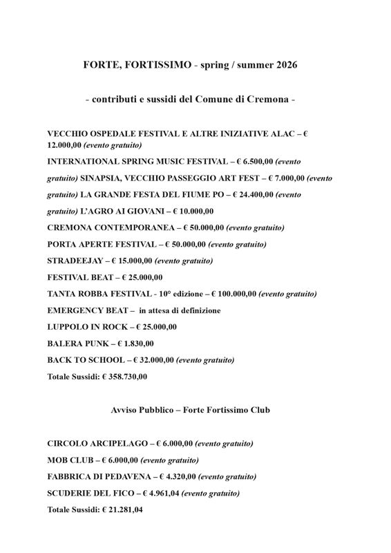 L’assessore al Turismo, Espressività giovanile e Associazionismo Luca Burgazzi ha commentato al riguardo: “Forte, Fortissimo cresce insieme alla città: questa seconda edizione rappresenta un’evoluzione concreta di un percorso che oggi si dimostra solido e sempre più credibile. Cremona sta costruendo una propria identità contemporanea anche attraverso la musica, capace di dialogare con i giovani, attrarre pubblico e generare nuove opportunità. La qualità e la varietà della programmazione 2026 sono il risultato di un grande lavoro di rete”.
