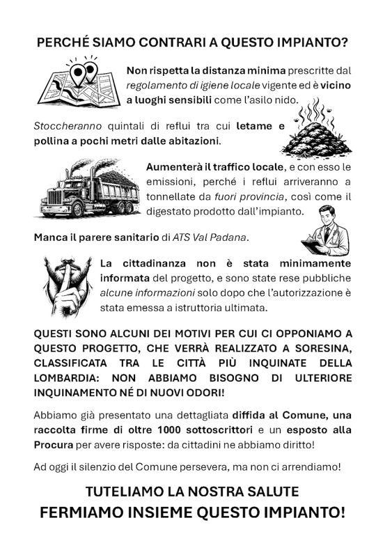 "Questi - concludomo i promotori della raccolta firme - sono alcuni dei motivi per cui ci opponiamo a questo progetto a Soresina, che ricordiamo essere una delle città più inquinate della Lombardia, mentre il silenzio alle nostre osservazioni persevera".