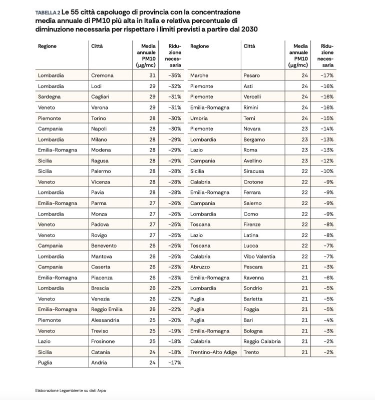 Nella tabella qui sotto, tratta dal rapporto Mal'Aria 2026, l'elenco delle città italiane con i relativi sforamenti per superamento dei parametri di legge per le polveri sottili.