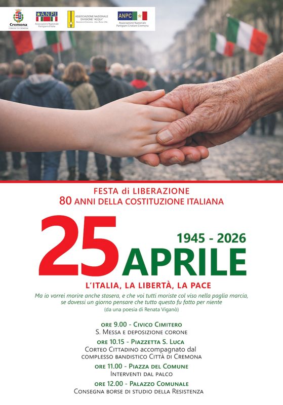 In occasione dell’81° anniversario della Liberazione, il Comune di Cremona, in collaborazione con il Comitato Costituzione Liberazione (Associazione Nazionale Partigiani Italiani, Associazione Nazionale Partigiani Cristiani di Cremona, Associazione Nazionale Divisione Acqui – Sezione di Cremona) ha predisposto il programma per la celebrazione del 25 Aprile.