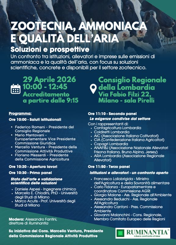 Modera Alessandro Fantini, direttore di Ruminantia, rivista online di settore, che così presenta l'evento: "La condanna inflitta all’Italia dalla Corte di Giustizia dell’Unione Europea per il superamento sistematico dei limiti di inquinanti atmosferici, in particolare PM10 e biossido di azoto, ha riacceso i riflettori sulla necessità di interventi concreti e tempestivi per il miglioramento della qualità dell’aria. Un’urgenza che riguarda in modo diretto anche il comparto agricolo e zootecnico, soprattutto nelle regioni del bacino padano. In questo contesto si inserisce un’importante iniziativa della Regione Lombardia che ha organizzato un convegno istituzionale“.