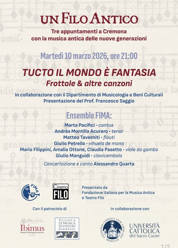 "Tucto il mondo è fantasia" è il titolo del secondo concerto in programma martedì 10 marzo alle ore 21 presso il Teatro Filo di Cremona per la rassegna "Un Filo antico - musica antica delle nuove generazioni", a cura di Alessandro Quarta per la Fondazione Italiana per la Musica Antica.