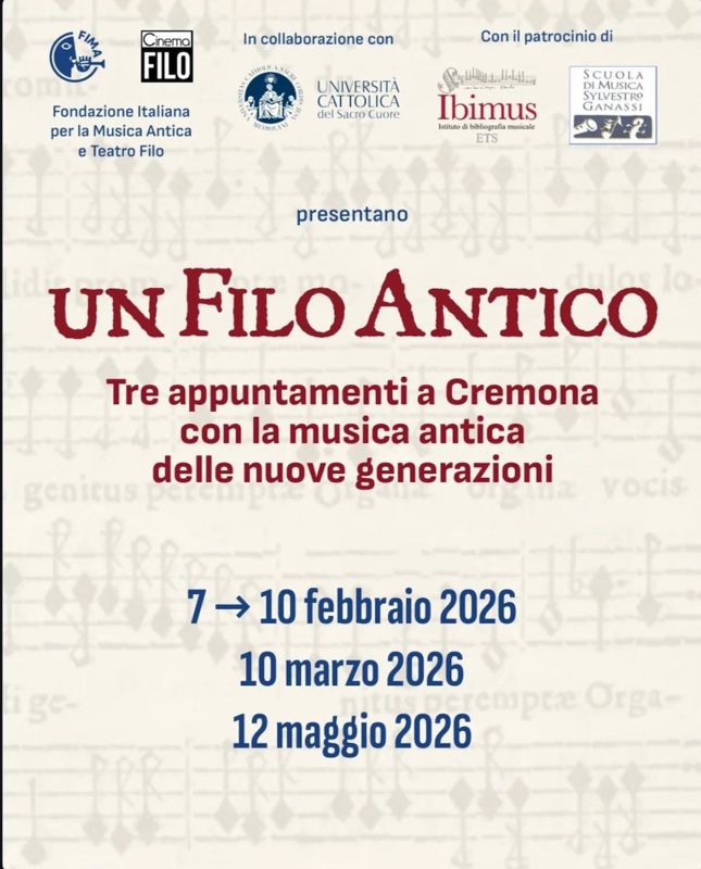 Martedì 10 febbraio alle 21 parte "Un Filo antico", la nuova mini-rassegna nata dalla collaborazione fra la FIMA - Fondazione Italiana per la Musica Antica ed il Teatro Filo - Società Filodrammatica Cremonese di Cremona, dedicata ai musicisti di nuova generazione, con guida all'ascolto.