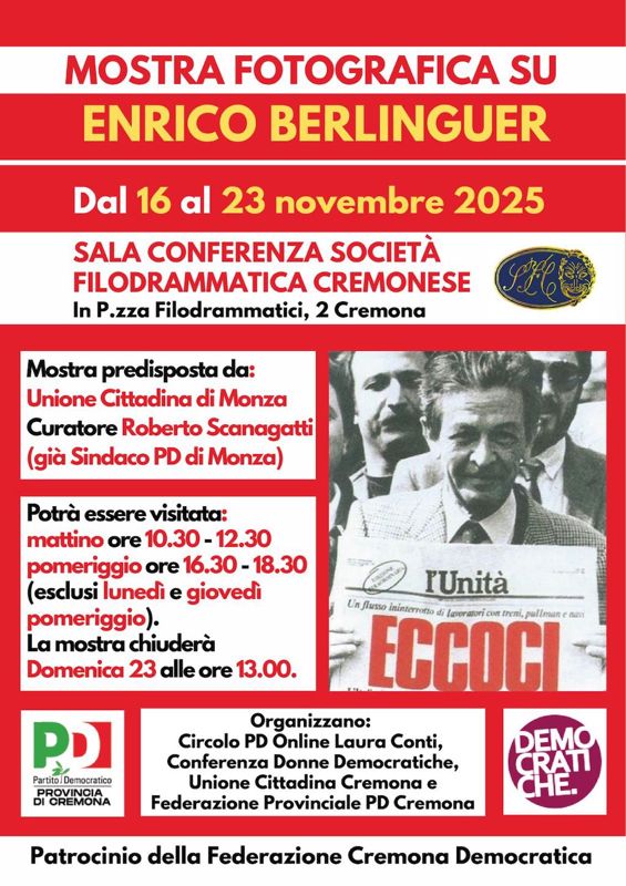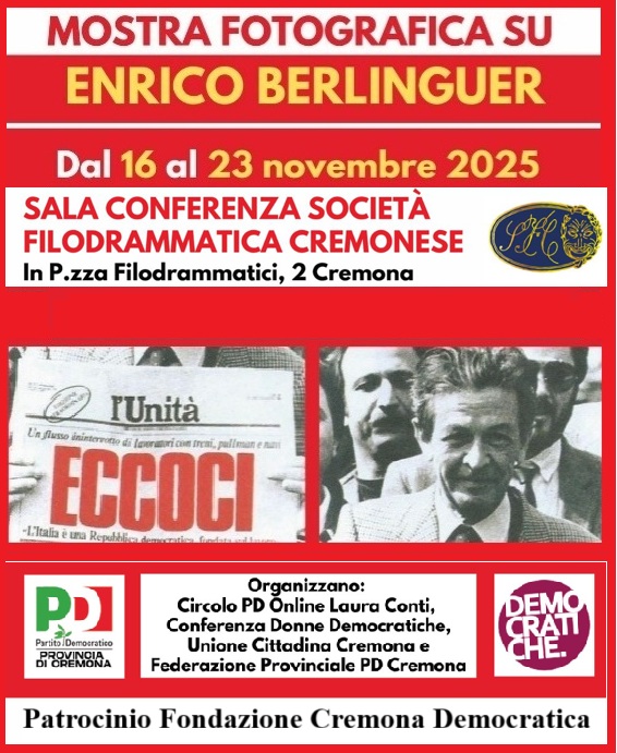 Dal 16 al 23 novembre 2025 Cremona ospita una mostra fotografica dedicata alla vita, alla carriera e al lascito morale del dirigente del Partito Comunista Italiano Enrico Berlinguer. A oltre 40 anni dalla scomparsa di Enrico Berlinguer, l'evento in programma intende realizzare un momento di riflessione politica per la conservazione e valorizzazione del patrimonio culturale della sinistra italiana e come opportunità di conoscenza, in particolare, per le giovani generazioni.