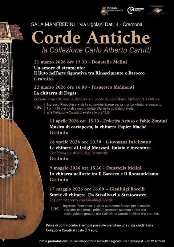 Da sabato 21 marzo a sabato 17 maggio nuovo appuntamento con la rassegna Corde antiche - La Collezione Carlo Alberto Carutti, ideata da Cremona Musei, in collaborazione con il Teatro A. Ponchielli, per valorizzare la prestigiosa collezione di strumenti antichi in comodato al Museo Civico Ala Ponzone.